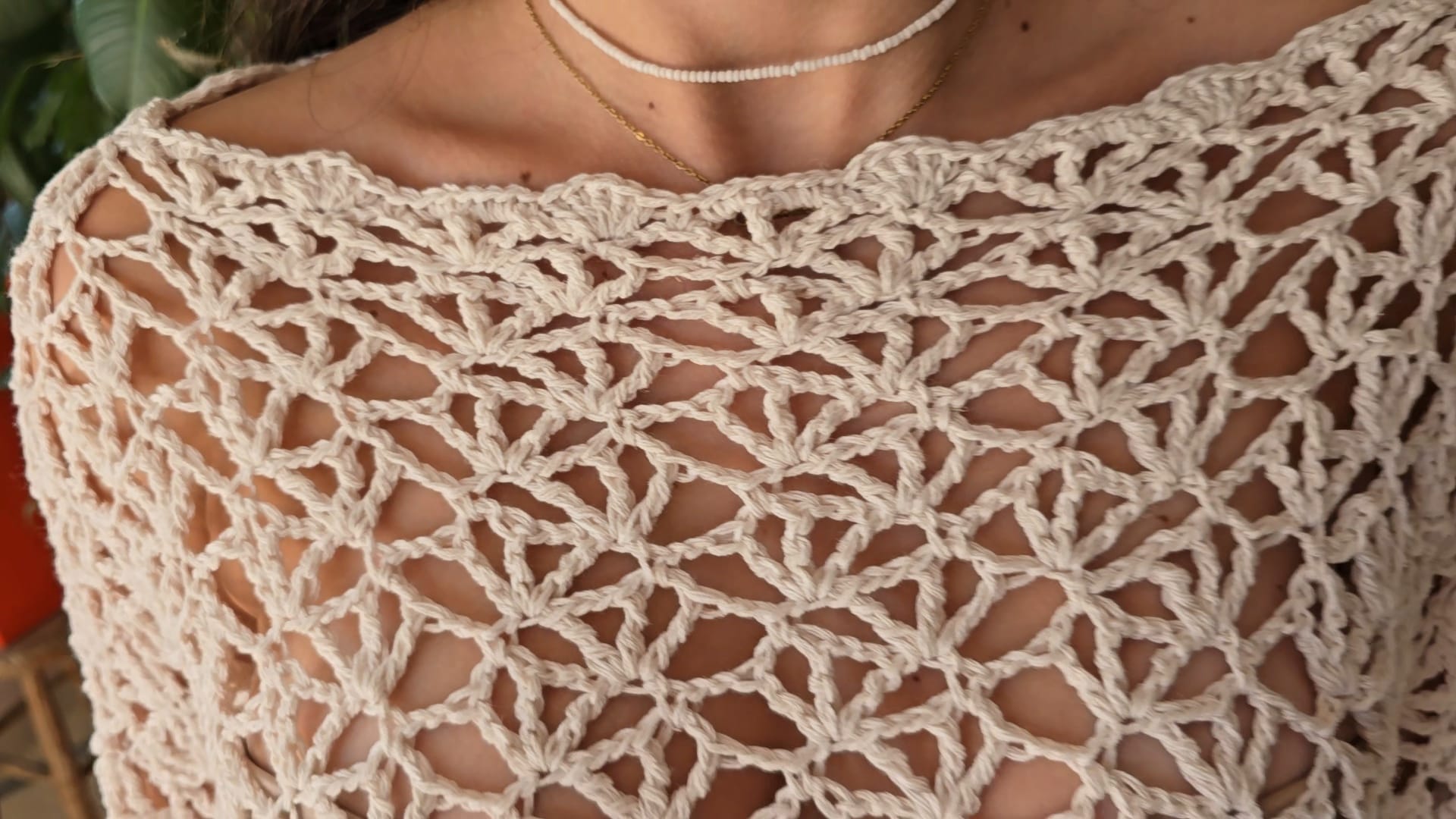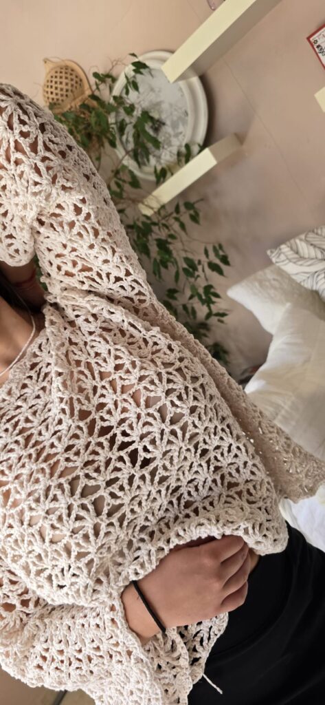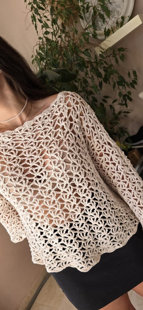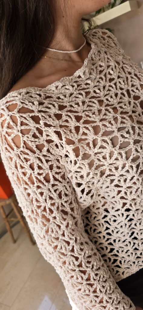 Antes de dar con el diseño final hice seis muestras diferentes, probando motivos y texturas. Y fue en la séptima prueba donde apareció este punto tan especial: un motivo ligero, elegante y lleno de aire, que convirtió al Serena en lo que es hoy, un suéter oversize tejido a crochet con cuello barco que combina comodidad y estilo.
