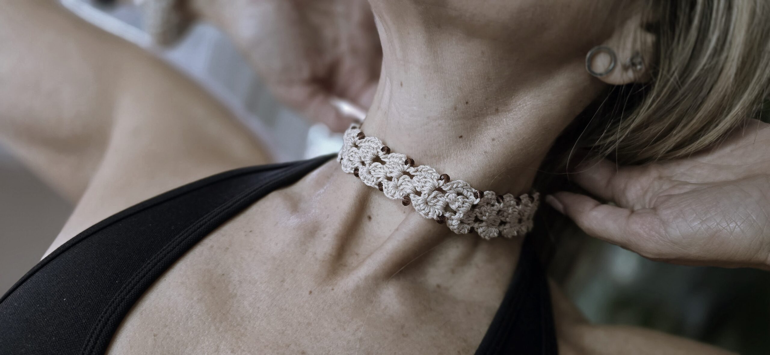 El Choker VÍNCULO es una gargantilla tejida a crochet pensada para acompañar, no para dominar. Se posa suavemente sobre la piel, siguiendo el movimiento natural del cuerpo, como si siempre hubiera estado ahí.
